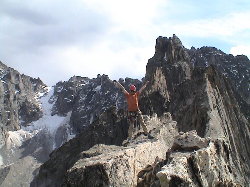 I wildly celebrate P11. Note that the `summit' register is here and this is the apparent summit as seen from the lake; however, all the rock behind me is actually as much higher as it looks. AHT is visible just left of center.