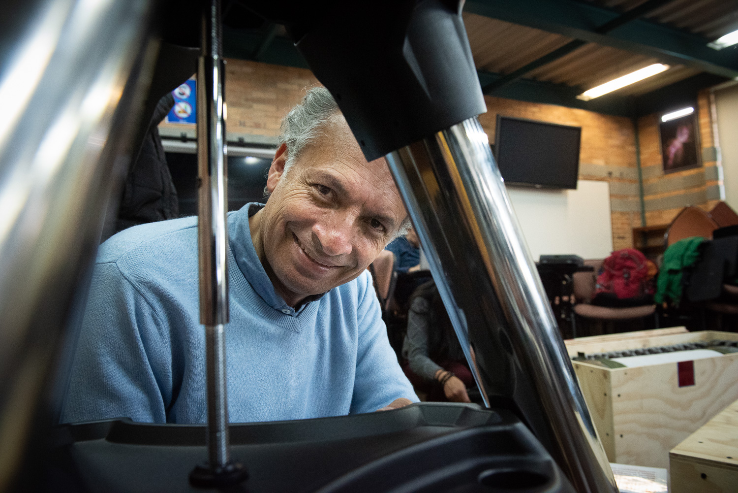 | Alfonso Caycedo runs the Collegio Abraham Maslow that has sent the telescope. "Oh look -- it's nothing but clothes inside!" (But dig deeper and he'll find a mount in that box.) |