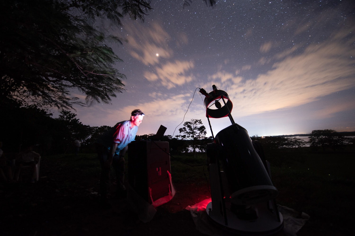 | Kat sets up the telescope. To the right is the beautiful Rio Magdalena. And the glow just above the river? That's not city lights, but lightning starting to move in. |