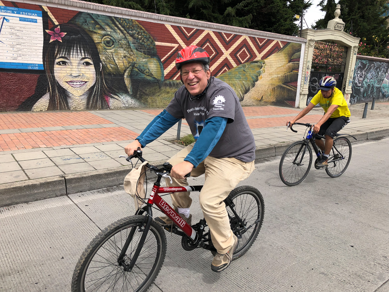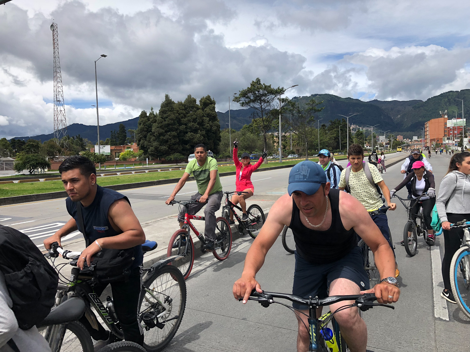 | And then... back to Bogota. We drive back on Saturday, and then have Sunday free. I'd heard for years about the city's Ciclovia, where Bogota shuts down some 100 km of roads every Sunday, open only for cycling. (Mexico City did a very similar Cicloton every Sunday, whiech we often rode when we lived there.) Kai, Ted, and I rent bikes and head out. Paula of Biking Bogota has set us up with bikes and a map. |