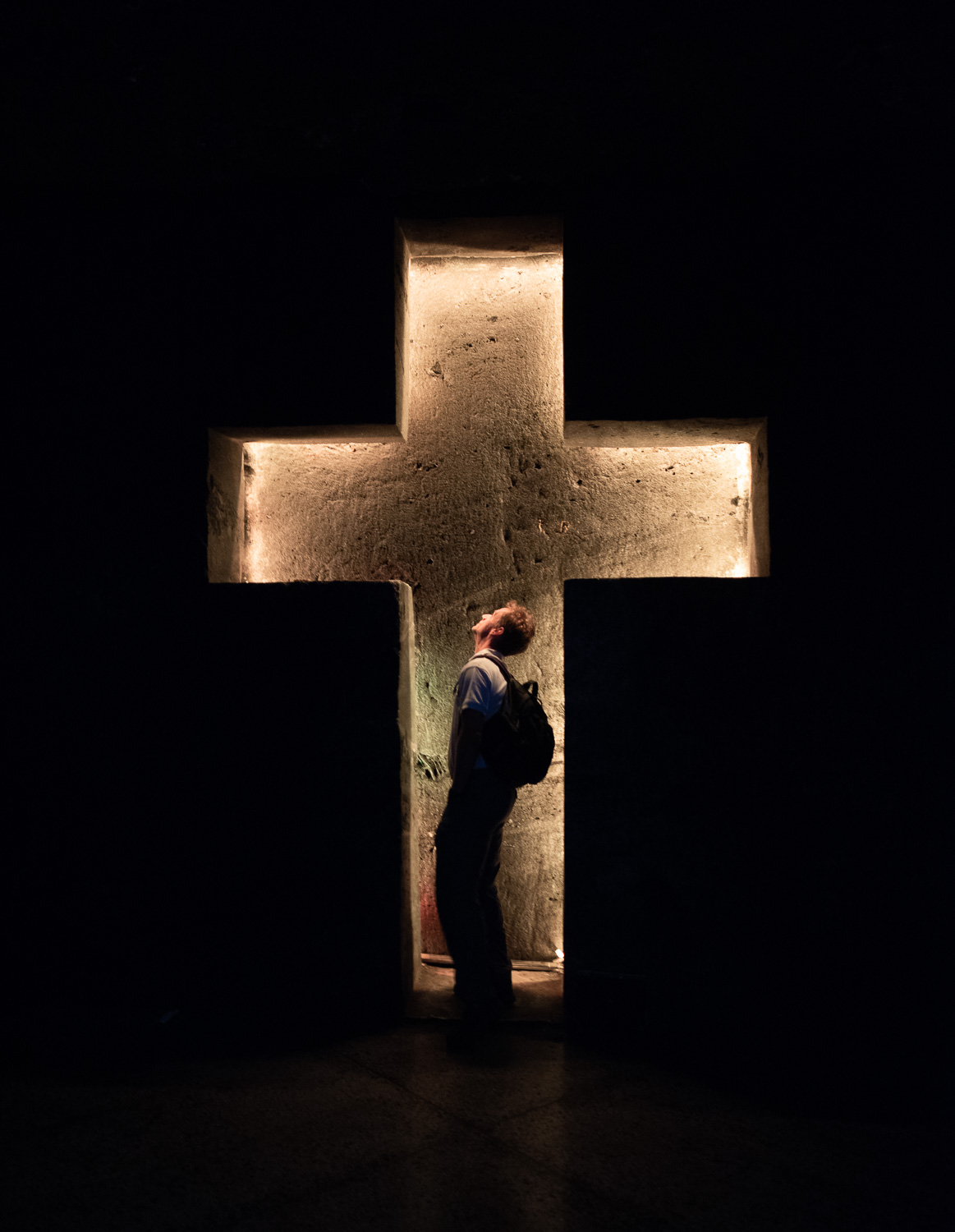 | Kai checks out one of the 15 large 'stations of the cross' -- carved into salt -- at the underground cathedral. |