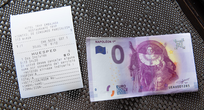 | Breakfast was included with our hotel, but we still were issued a bill for $0 ($ = Colombian pesos) every morning. Fortunately, someone had a 0 EUR note with which to pay. |