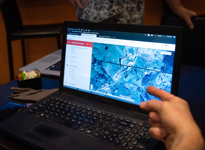 | Rodrigo, Giovanni Gonzalez, Alfonso Caycedo, and an interested passerby (a U Nacional pharmacy student) check out the CCD images of the field. |