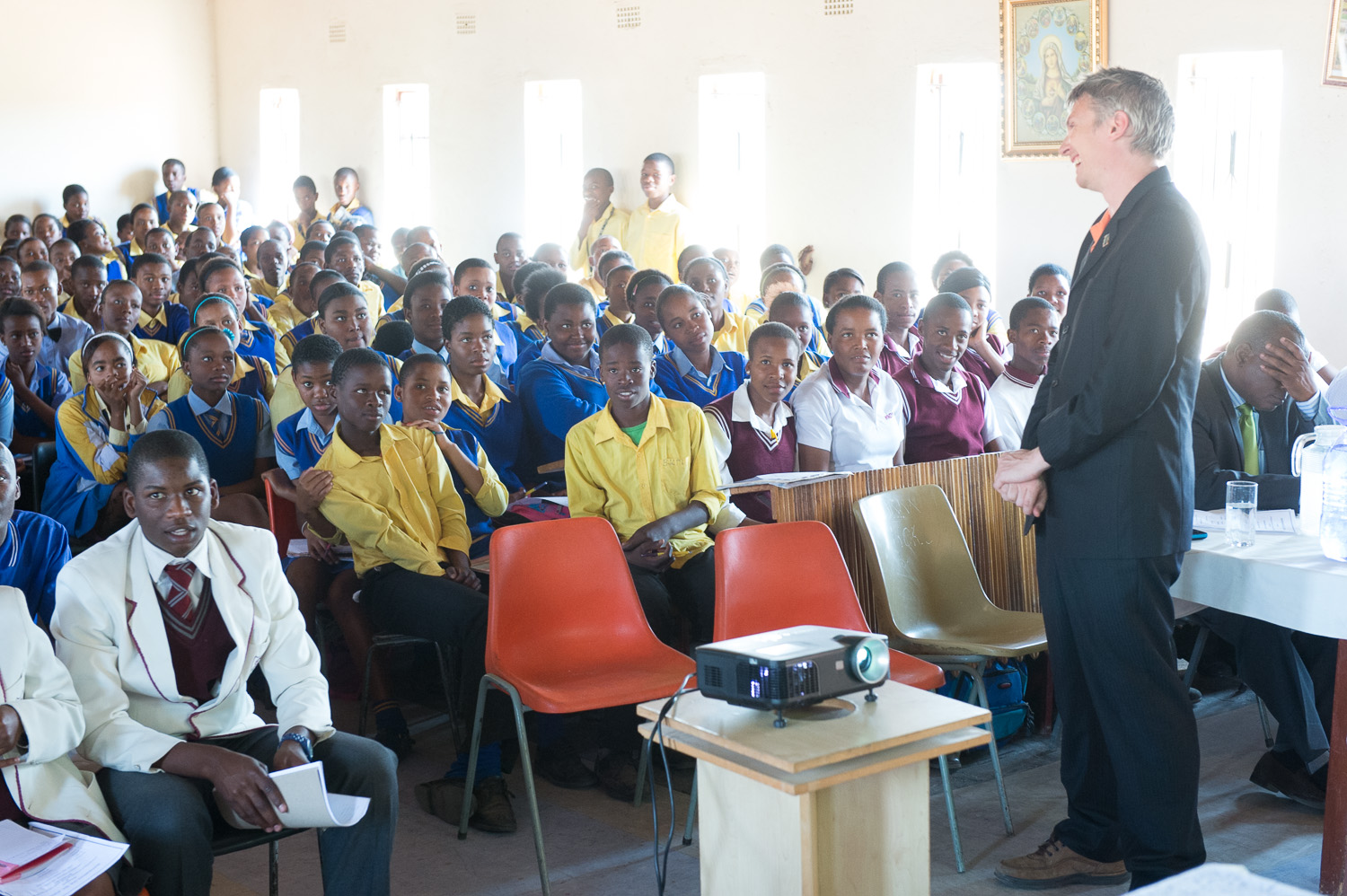 | The school was not large enough to accommodate the crowd, so we used the nearby church (a few hundred meters from the school). As I showed up, the learners were walking over. |