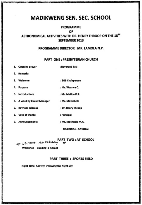 I spent a day with them, giving three long talks (with Q&A longer than the talks!), followed by a night-time observing session with two telescopes I'd brought. Usually school is out at 3 PM, but on this day, everyone stayed until 9. Madikweng has 250 learners, and there were a good number who were able to visit from other schools as well, such as Dendron Secondary, a much larger school with great science closer to Polokwane.