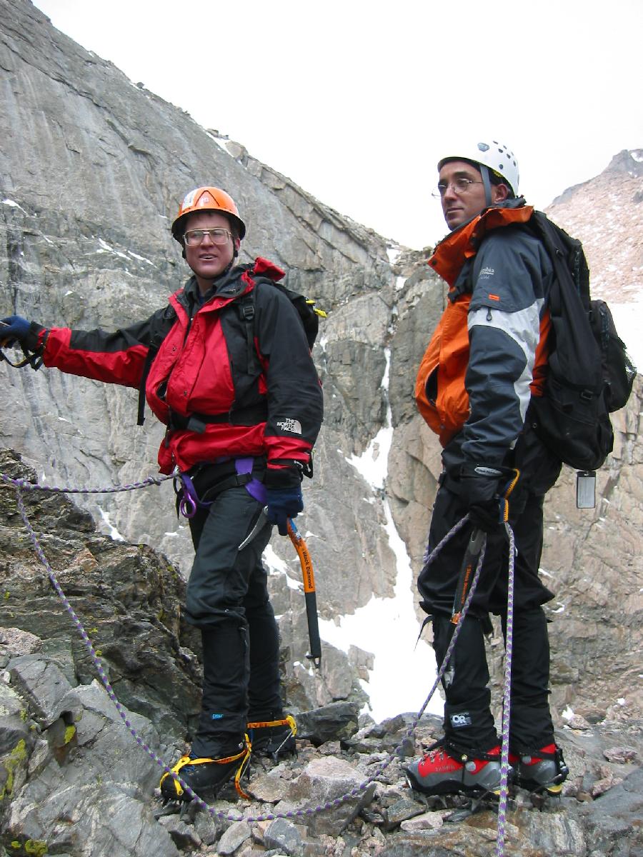 Halfway up, near the top of the Flying Buttress. Escape possible to the side. The couloir between Fathi and Doug is (I think?) the Dark Star route.