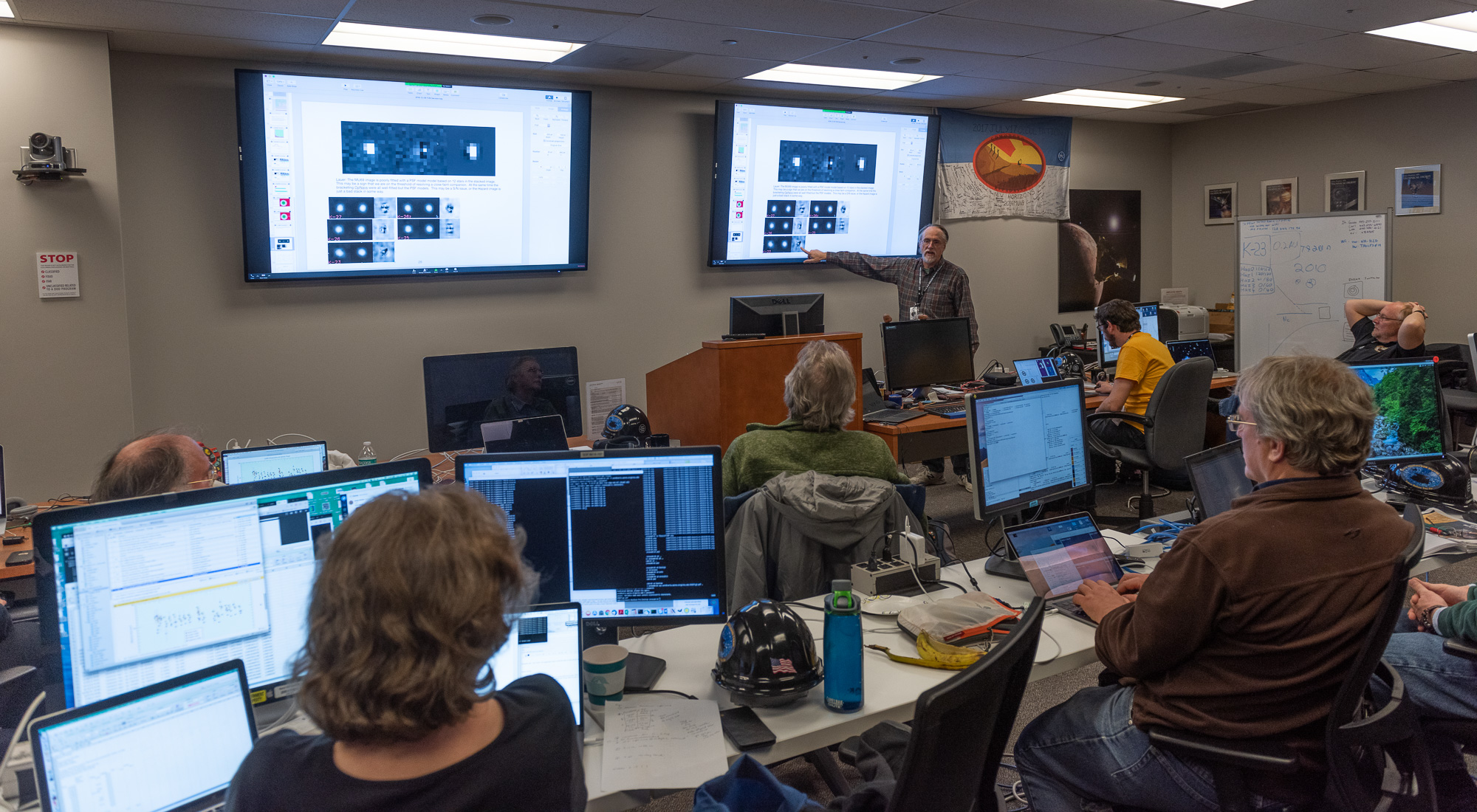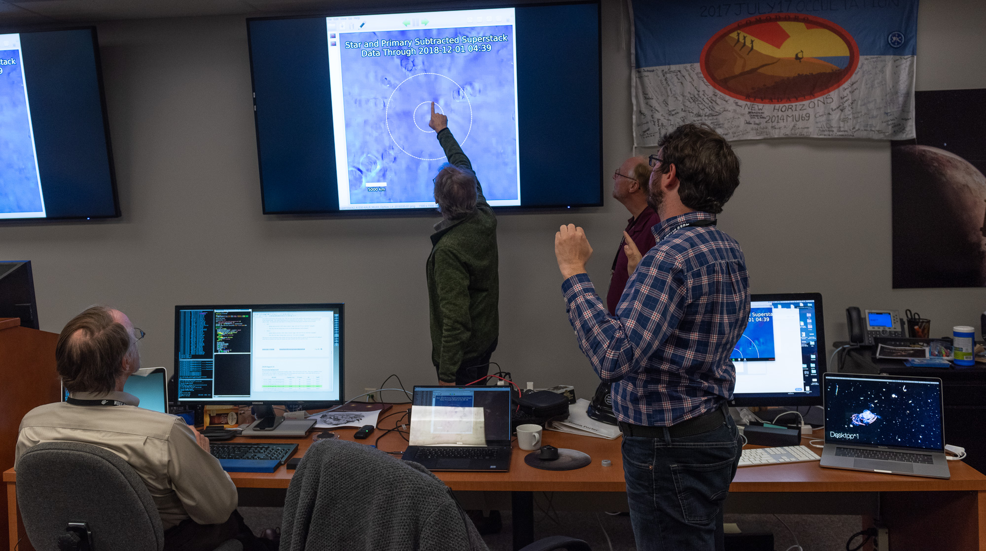 After 18 months of telecons and planning, we got to work on December 1, 2018, a month before encounter. By this point New Horizons' image of MU69 were becoming good enough that we could start to resolve structure in the system. (The images were far better at this point than what we had gotten from Hubble: HST is much larger, but further away.) We were far from seeing any detail on the body itself, but if there were very large, very bright clouds of dust thousands of km across, then even our initial surveys on December 1 would see them. And as we closed in, our scale got much better, to the point where we could resolve rings or clouds on the 100-km scale (and moons far smaller than that). These images would inform our decision over which trajectory to recommend.
