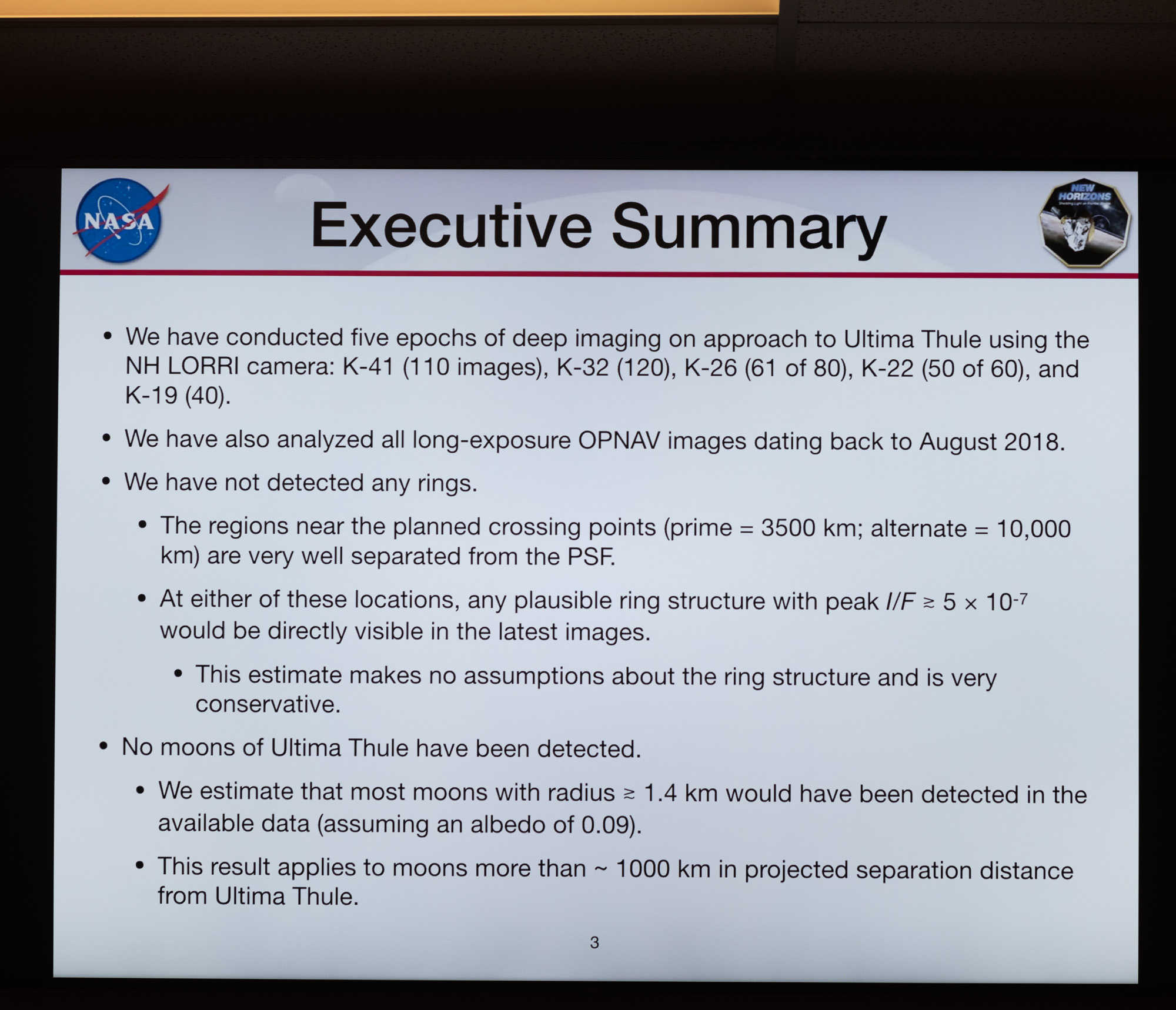 In the end we found: absolutely nothing! No moons, no rings, no clouds of dust, down to our limit of detectability (for moons, 1.4 km assuming albedo = 0.09 outward of 1000 km; for rings and dust, I/F < 5e-7). Furthermore, we identified no stable orbits that dust even could theoretically survive for long times at MU69. We were confident that, with the data we had, the MU69 system looked clear, and we recommended the mission fly the Prime trajectory.