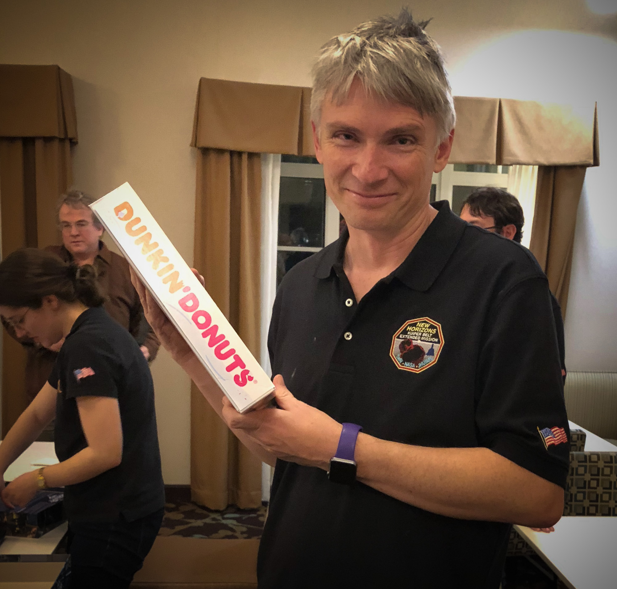 | Mark Showalter, Doug Hamilton, and David Kaufmann. Behind them is the signed flag from the summer 2017 MU69 occultation campaign to Comodoro, Argentina. We're at K-31d. |