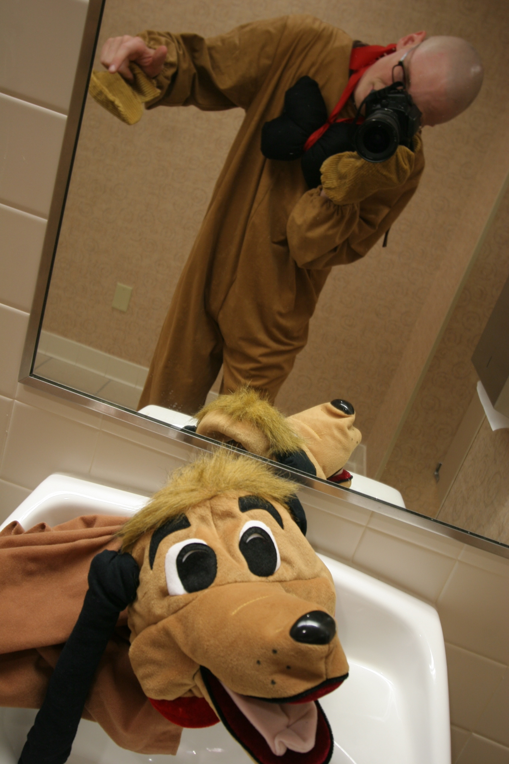 | Pluto suits up in the restroom, soon after his tail has fallen off and been repaired. |