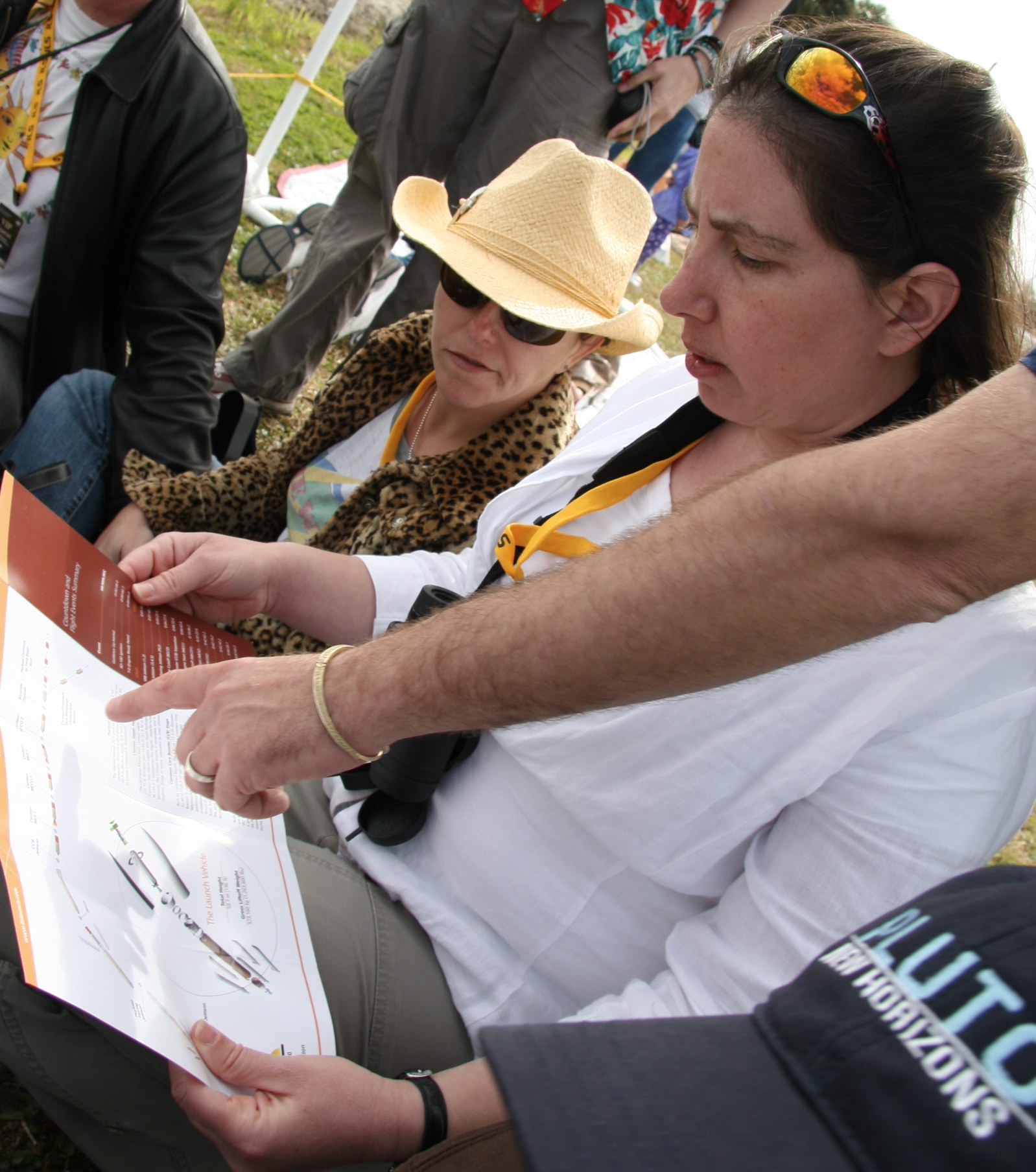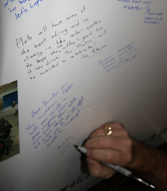 | Deputy Project Scientist Leslie Young pulls out her Pluto albedo map and gets to work on the real science here. |