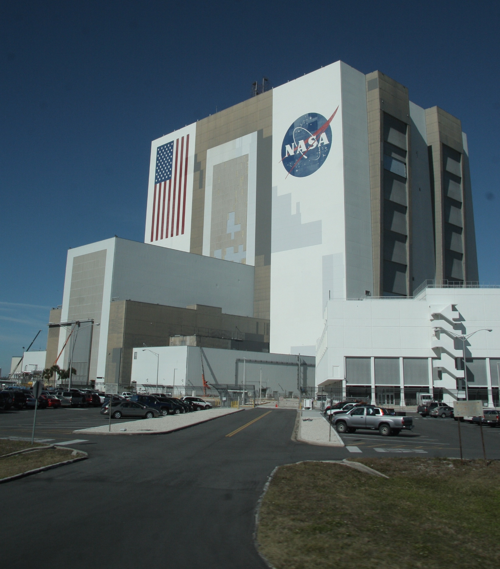 | The space shuttle's transporter (`crawler'), next to the vehicle assembly building (VAB). |