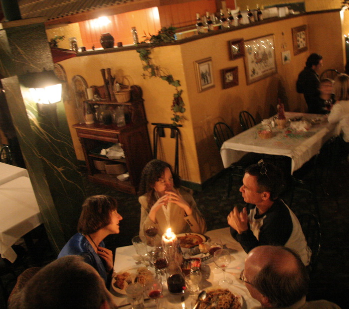 | We repose post-non-launch. Our badges get us a free round courtesy of shuttle HVAC technician Ron who sees us come in. Note the astronaut shots on the back wall. |