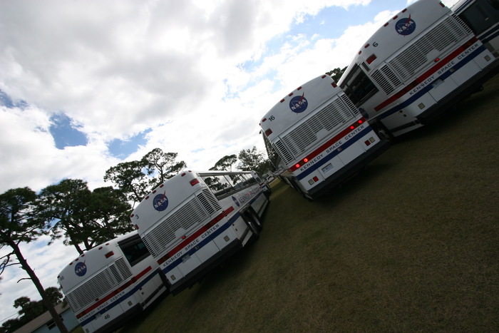 | Several of the 14 busses. We were allowed busses for three launch attempts, so there's an incentive to get off today. |