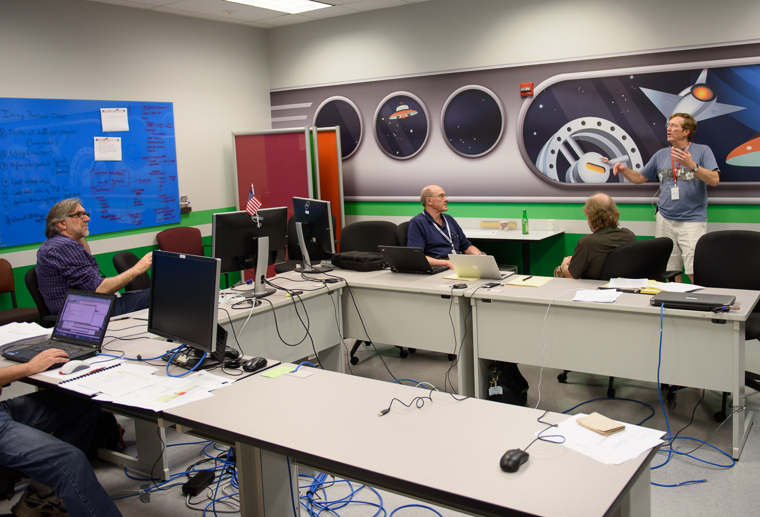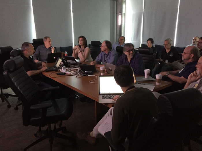 | Joe Peterson and Amy Teitel talk it up in the back row. Note the TODAY sign on the timeline on the wall -- we are at P - 4 days. |