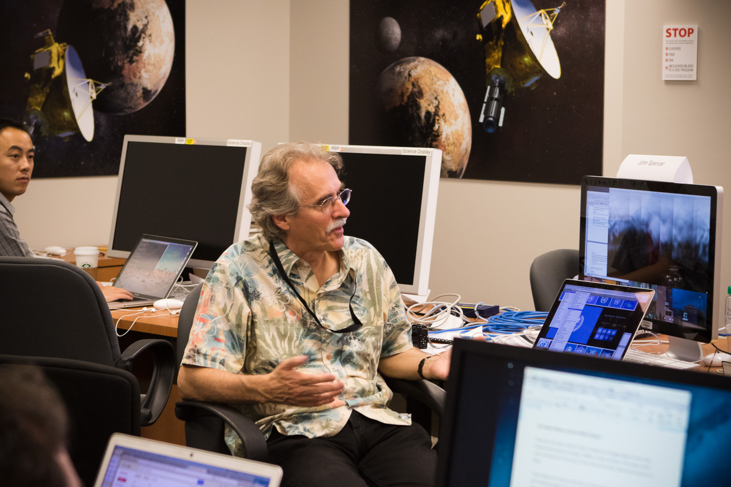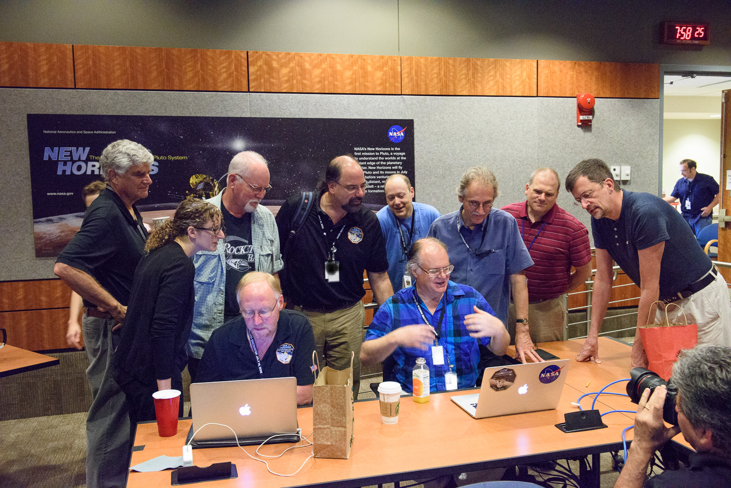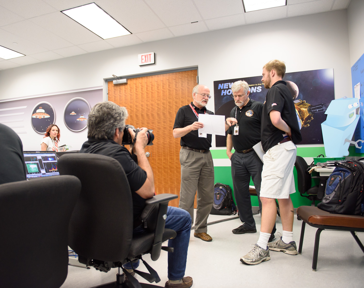 Usually APL is a secure 'no photos' zone. But New Horizons is a historic mission, and it would have been a loss to not be able to document the human side of the encounter. Through special arrangement with the mission and APL, several members of the New Horizons team were given permission to take pictures in APL's Building 100, where the Science Team was based. Although I spent most of my time doing mission work, I usually took my camera with me, and was able to photograph the team freely throughout the encounter. The team was spread over a half dozen large rooms at APL, working in very close proximity for most of the encounter. Many of the engineers and managers are in Building 100, although some are on APL's main campus.