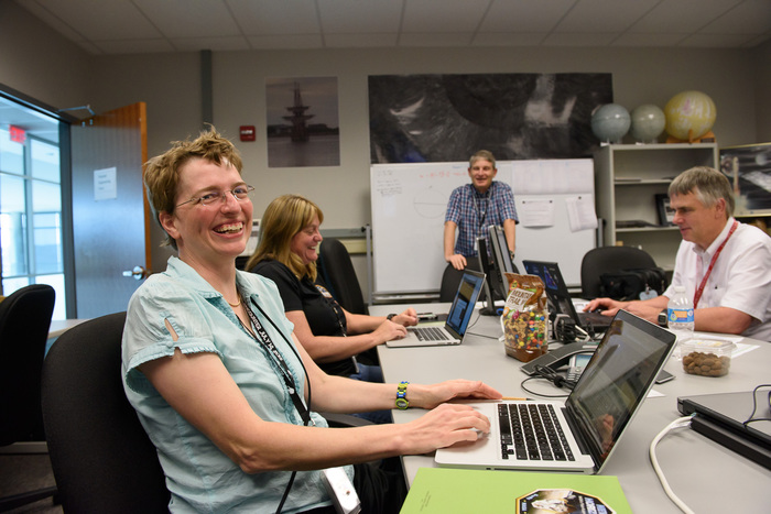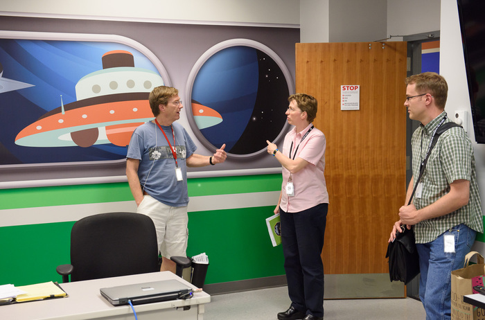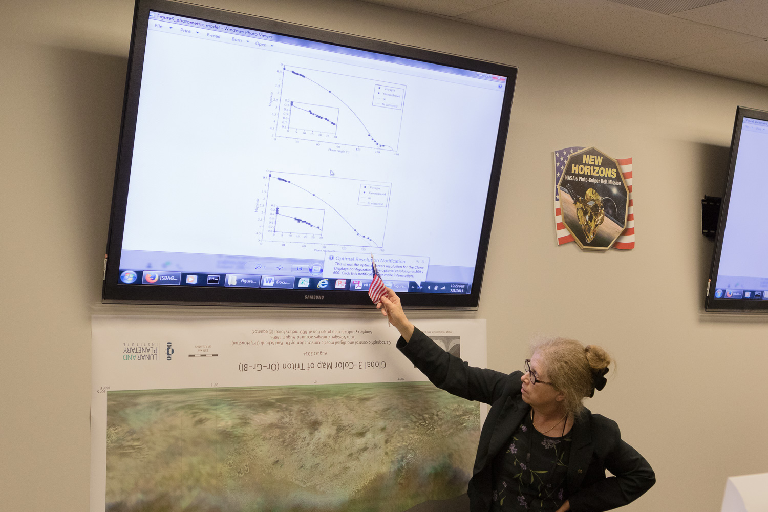 | Dennis Reuter, Will Grundy, and Dale Cruikshank wordsmith over a press release on that color MVIC map. The draft reads "Pluto, Charon Shine in Exaggerated Color", which was changed to "false color" by the time it made it into the (real release) on the day of the flyby. "But the colors aren't false -- they're at the right wavelengths, just exaggerated!" |