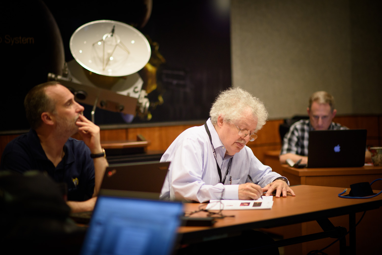 | Alan Lunsford, Joe Peterson, and Eddie Weigle share denials of responsibility. In front of them is one of the 'playbooks', the human-readable spacecraft observing schedule. |