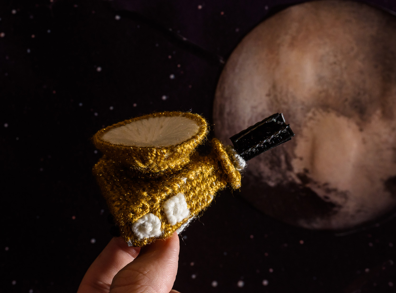 | Far off in space, Emily Lakdawalla's crocheted New Horizons spies an icy planet. What is this planet made of? Cotton? Nylon thread? Or something even more mysterious? |