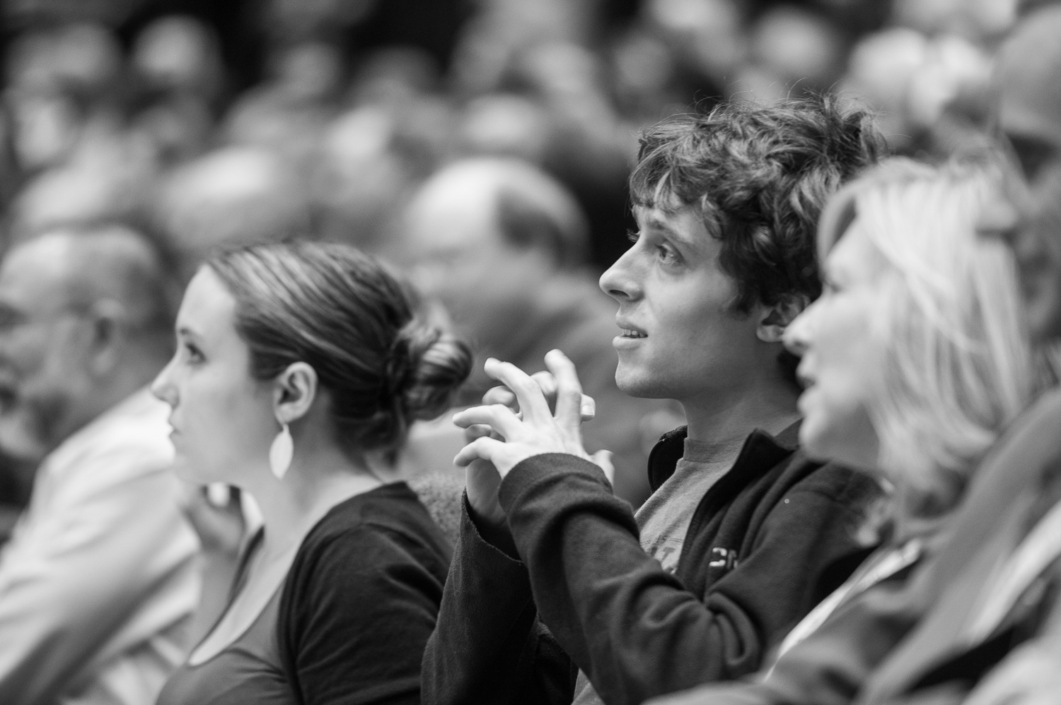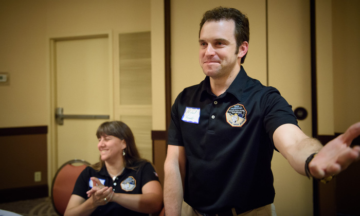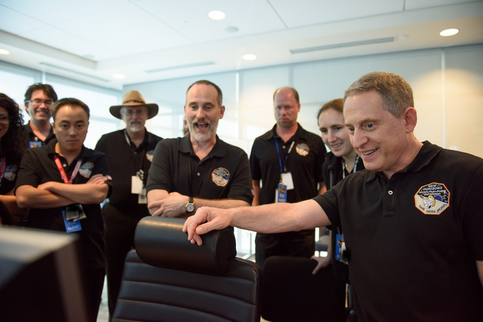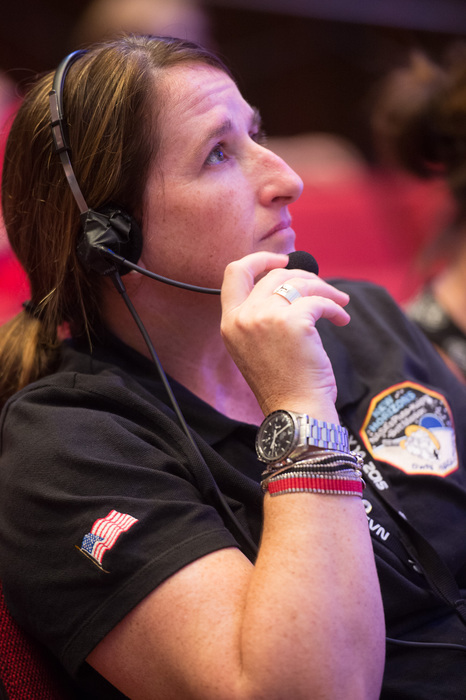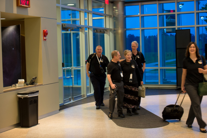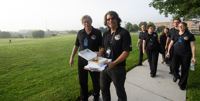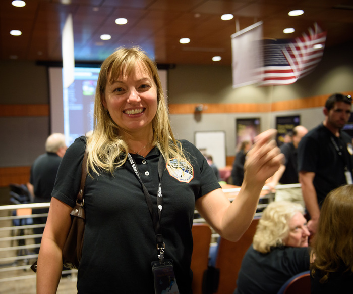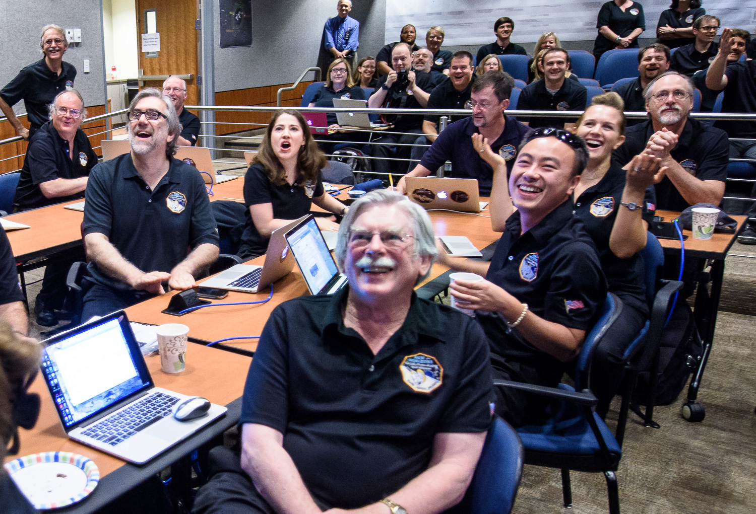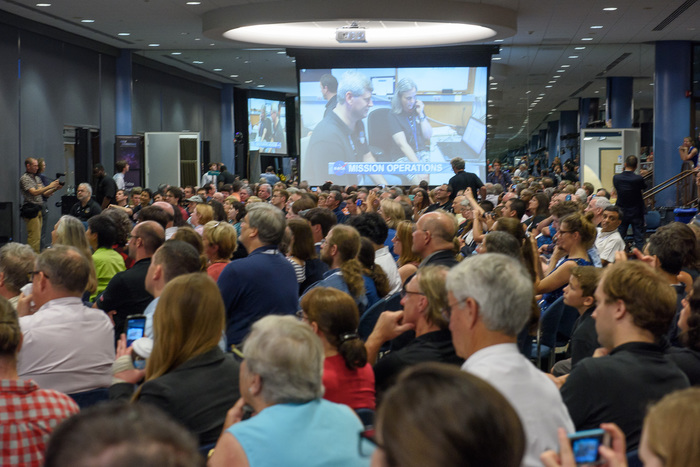 | Mission controllers and engineers from Mission Ops file into the Kosiakoff Center to much applause. |