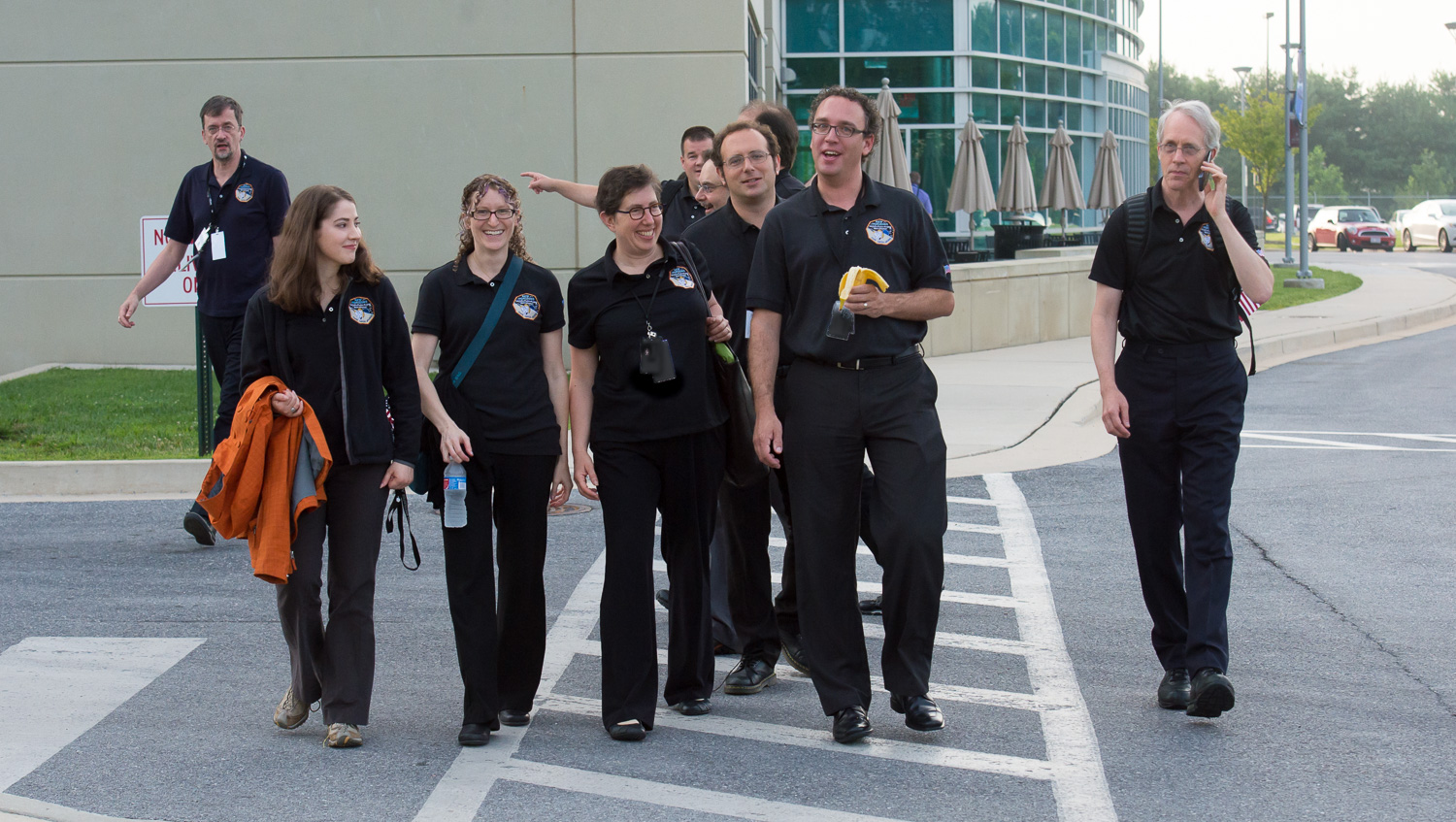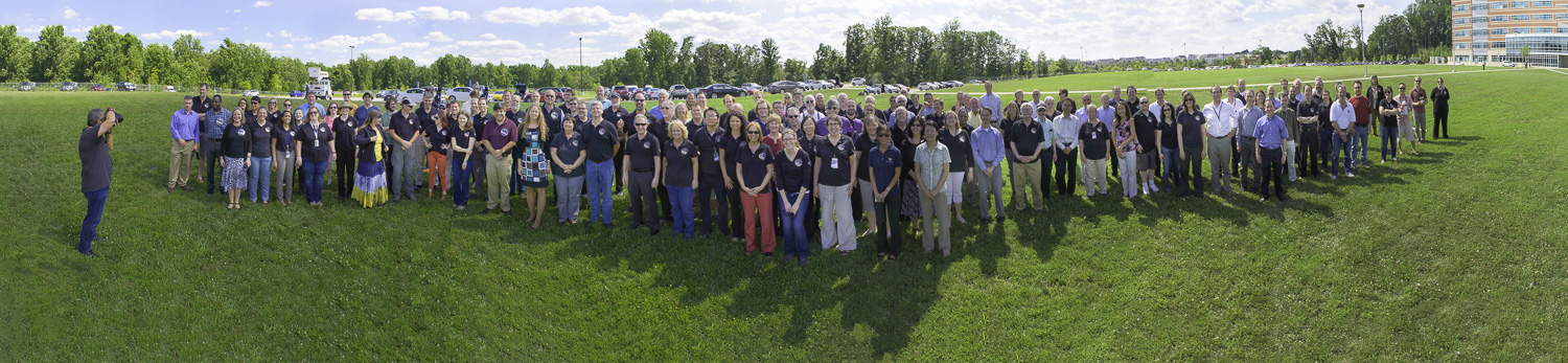 | New Horizons team outside Building 100. This was just after Ed White shot the team 'Thank You' shot from APL's cherry picker. Michael Soluri advised me 'I'm going to be in New York, but you should get a nice group shot. Make it back-lit -- shoot right into the sun.' So I grabbed everybody as they were trying to run back to their offices from being outside for long enough already. "You have two minutes," said Alan. This was a panorama of about 30 shots, stitched together. And that's Ed White on the left, also shooting the whole group at the same time. |