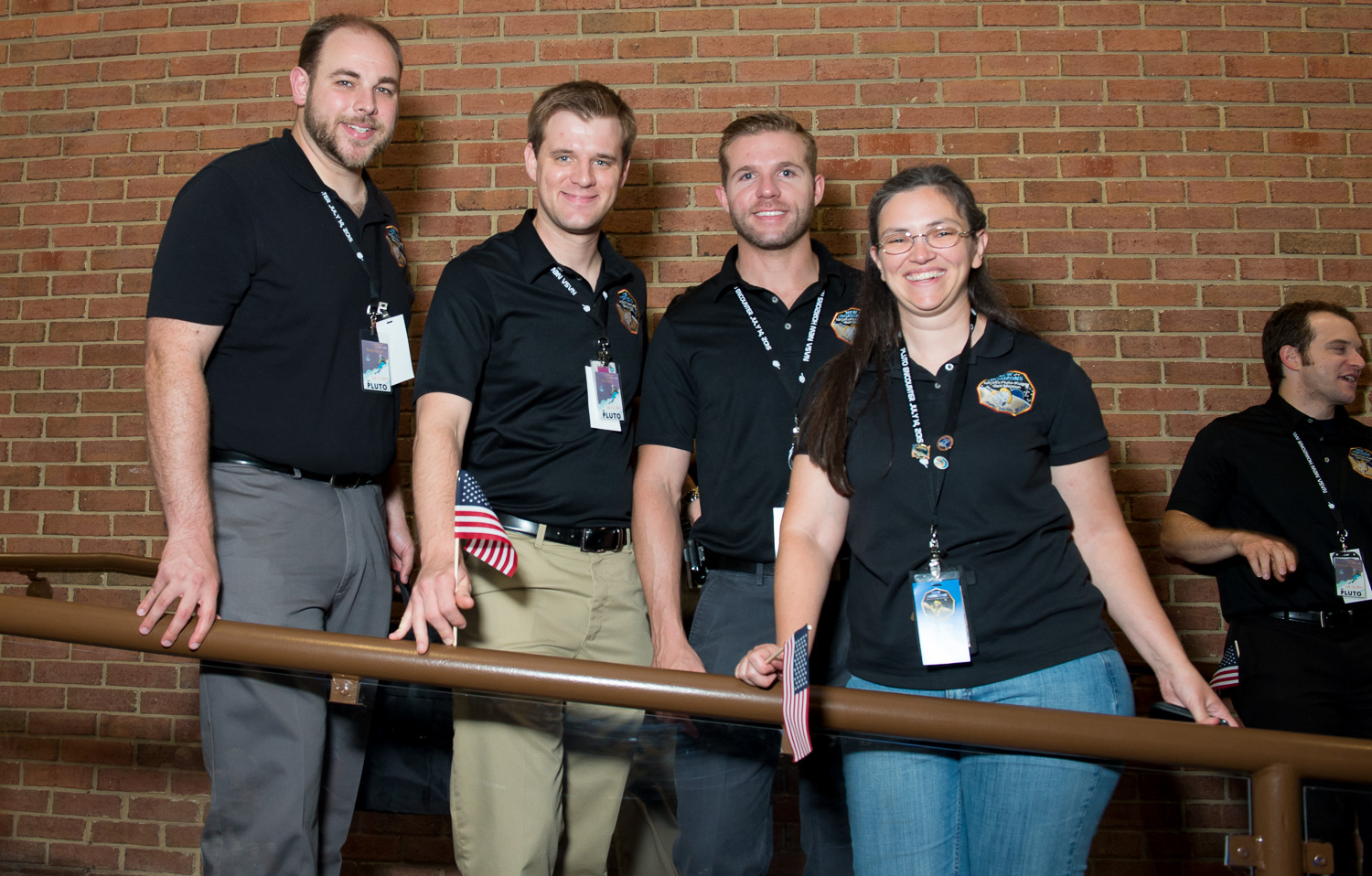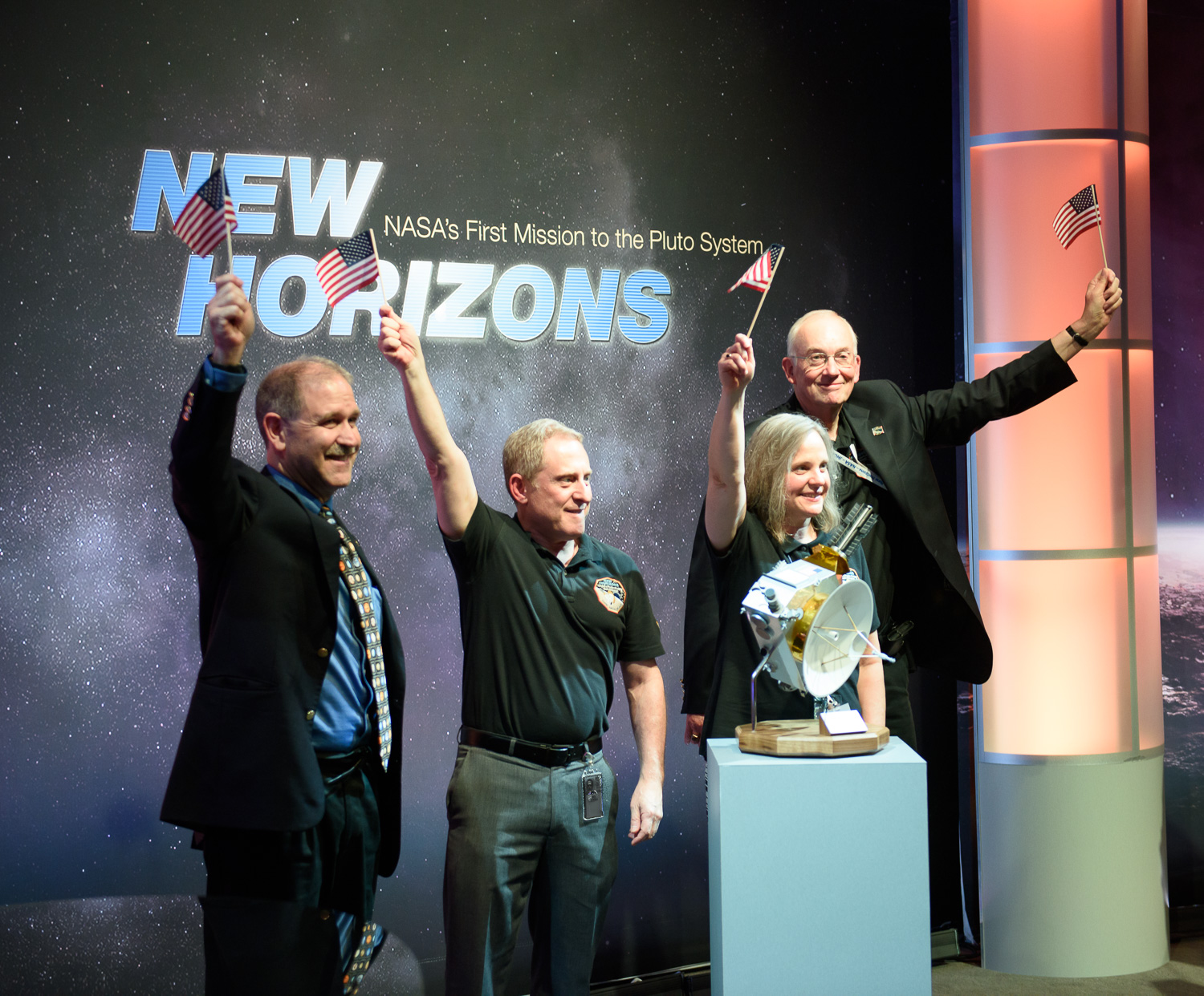 | John Grunsfeld, Alan Stern, Alice Bowman, and Glen Fountain wave those flags at the Kosiakoff Center, post-flyby. |