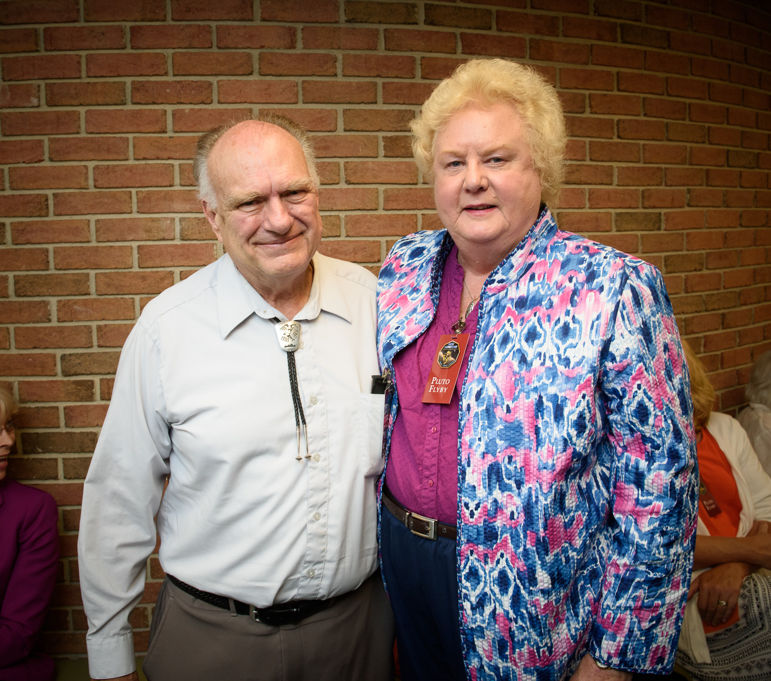 | It's Jim Christy (discoverer of Charon) and Charlene Christy (namesake of the moon)! I talked with Jim for quite awhile. And Charlene and I go back a long time: at the Pluto launch in 2006, Leslie Young took the opportunity to decorate my head like a surface map of Pluto, using the best-available data at the time. In one of the highlight of my scientific career, I talked Charlene into orbiting me. here and here. |