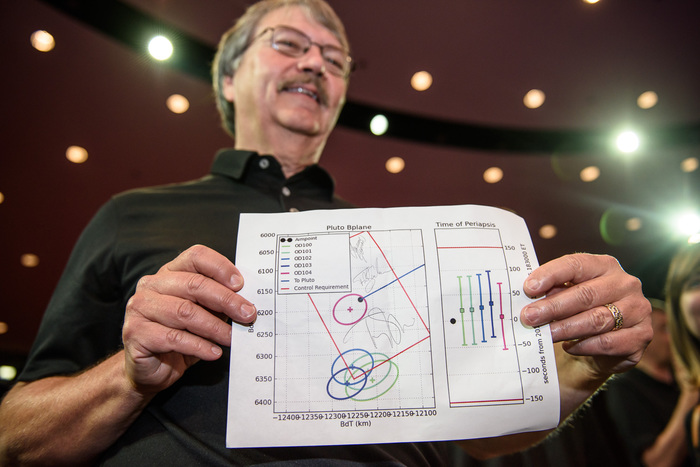 | Navigator Bobby Williams shows off his Styx autographs. "The center point on the plot is Pluto. Styx [the moon] is small enough that it doesn't work into our solution." |