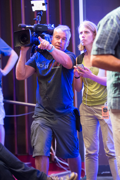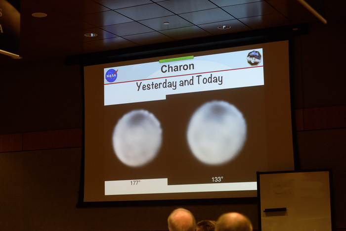 | About to show the first close-up pictures of Pluto and Charon! Dwayne Brown, Alan Stern, Will Grundy, Cathy Olkin, and John Spencer at the P+1d press conference at the APL Kosiakoff Center. If you're going to watch just one movie about Pluto, this is the one to watch. Everything we thought we knew about Pluto has changed in the last 24 hours. All of our models are wrong, and that's why they're all smiling. |