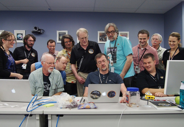 | Alice Bowman adores Brian! With mission ops crew: __, Ann Harch, Helen Hart, __, Brian May, Alice Bowman, Jon Vandergriff, Hong ___. |
