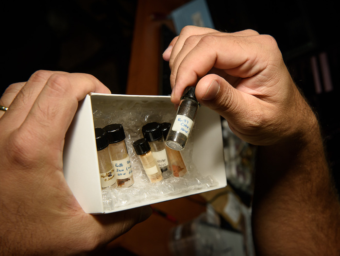 | Will Grundy shows off some tholin residue that Dale Cruikshank made in the lab and may or may not have left on Will's computer, as a candidate for Pluto surface composition. |