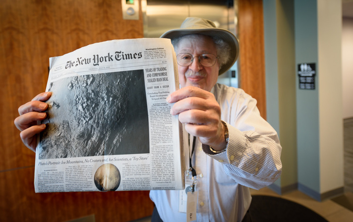 | Steve Maran shows off that NYT cover story! Steve is a science writer and retired astronomer, who was brought on as an embedded reporter within the NH team. |