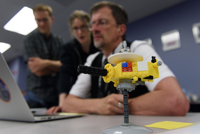 | Paul Schenk, with Eric Schindhelm, Kelsi Singer, and the LEGO! Yes, you can build your own! And speaking of LEGO, check out that one-off set featuring Alice Bowman, Leslie Young, Cathy Olkin, and Kim Ennico-Smith, as well as the final to-be-manufactured Women of NASA set. |