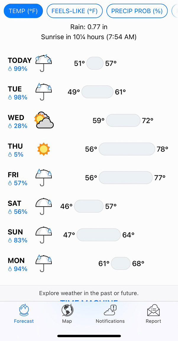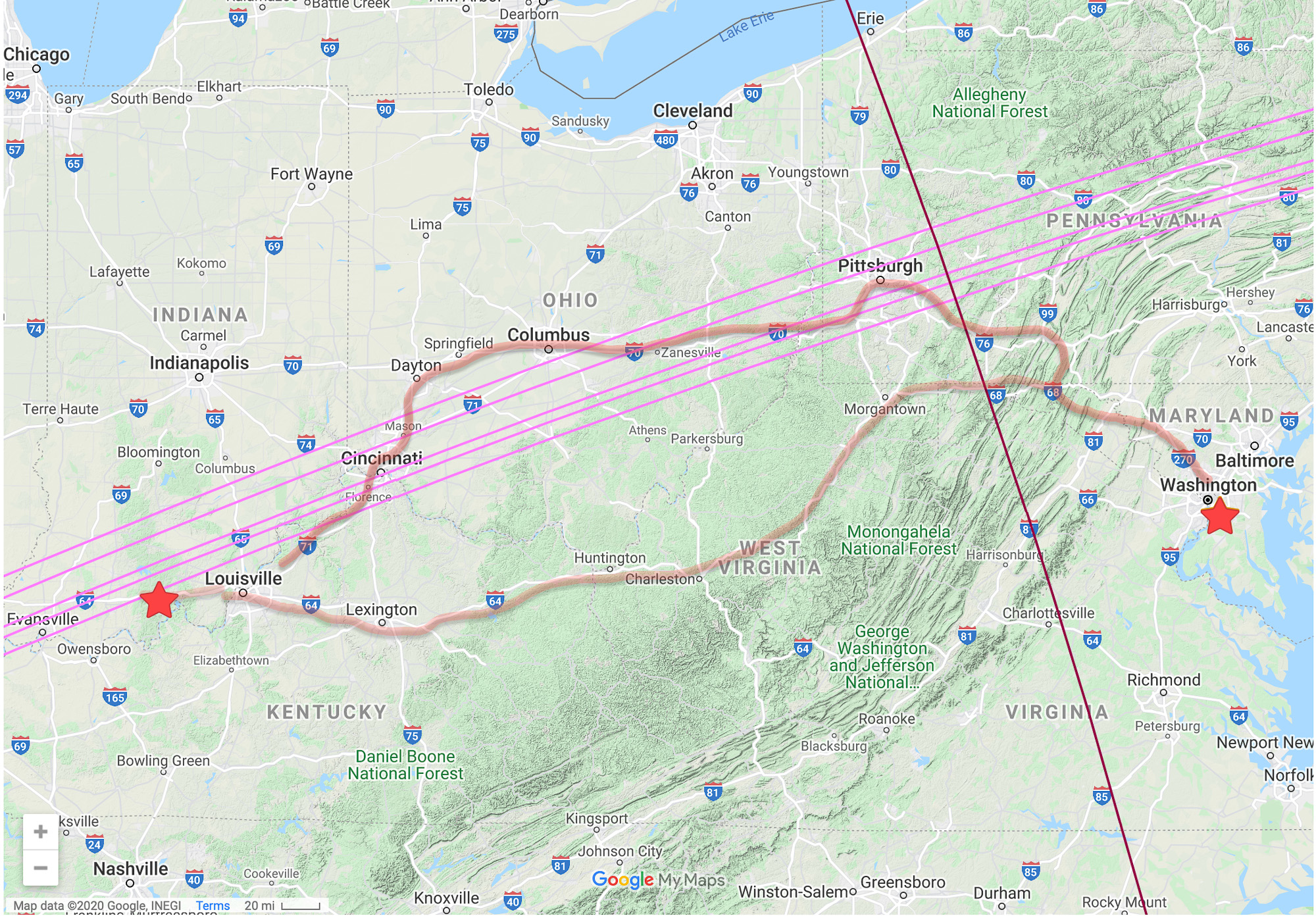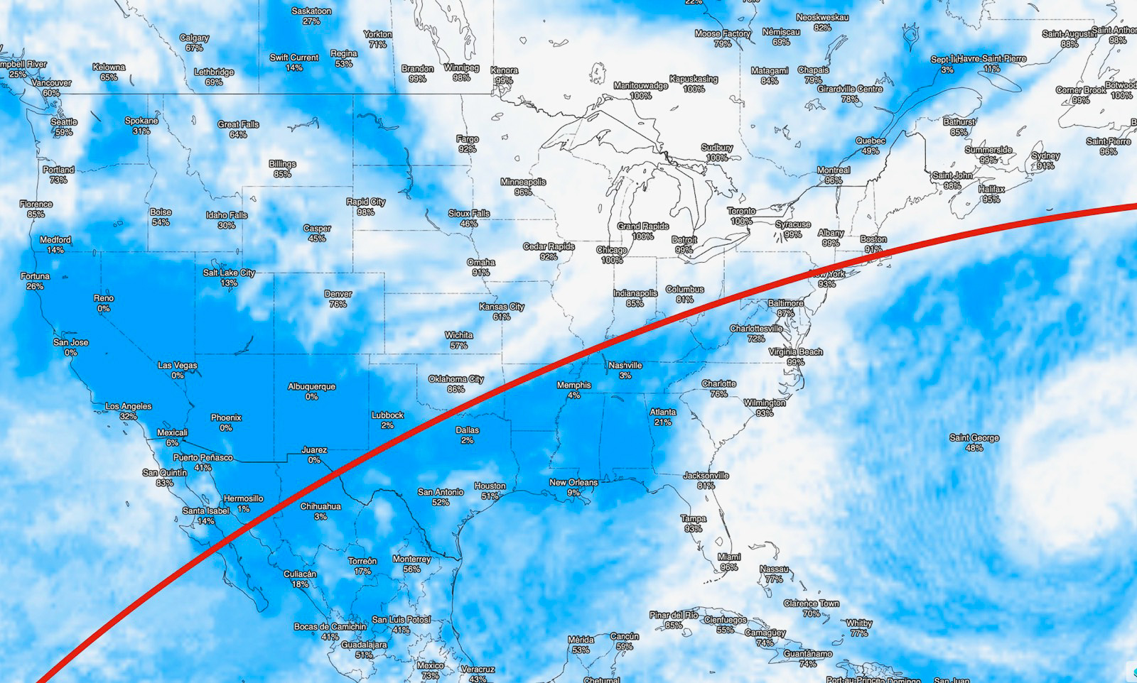 | At T-2 days, the weather looks pretty bad along our whole line! In fact, it looks like one could drive 1000 miles, from Massachusetts to Texas, and not hit clear skies until El Paso. |