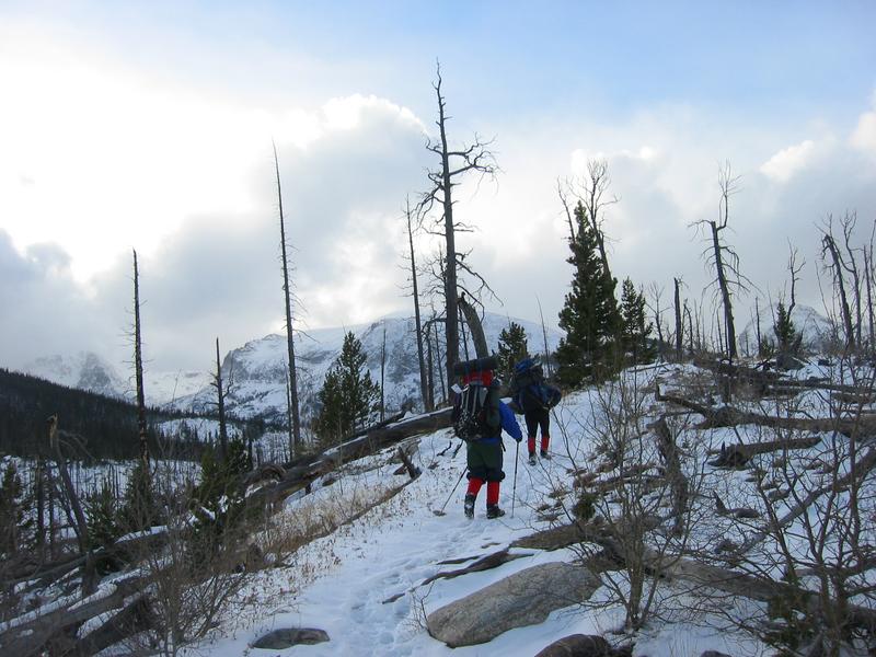 Kathy and Sarah hike toward the clouds. Note the thoughtful thinning of the forest from the 1978 fire, done for visibility purposes.
