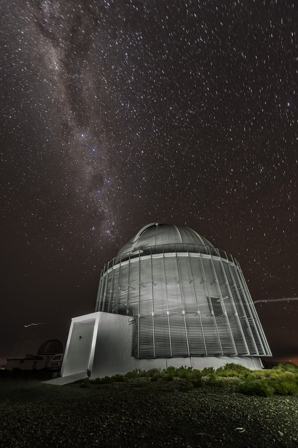 | I'm driving up to observe at the 1m. That's the LCOGT trio on the left, and the Japanese IRSF at right, with the 0.75 m (I think) in the mirror. |