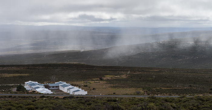 | We've driven up to Sutherland, about four hours from Cape Town. Here we're looking down on the hostel at SAAO, from the telescopes on the plateau slightly above. The hostel has a dining room, library, dorms, and so forth. The town of Sutherland is 10 km or so down, to the left. | |