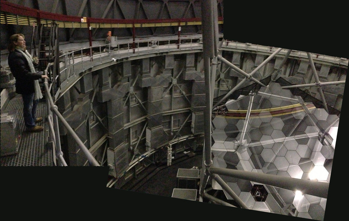 | Amanda inside SALT! That's the 11-meter mirror below. It's made of 91 smaller 1-meter hexagonal mirrors. All of them are spherical, rather than parabaloid, which means that they can be taken out and put back in a different position because they're all identical. The mirror segments that look dark really are -- they are the ones that are most in need of re-aluminizing. You can see at least two of the mirrors are missing, due to aluminizing or other maintenance. From an optical standpoint, a missing mirror does not make a big difference. | |