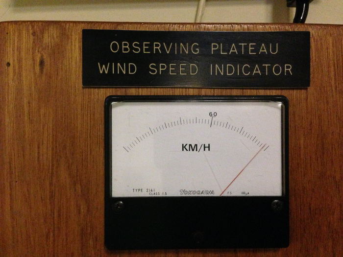 | Inside the hostel is one indicator. Only one number counts, which is the speed above which you cannot open the telescope domes. The winds were above it nearly the whole time I was there. Looks like around 98 kph now! | |