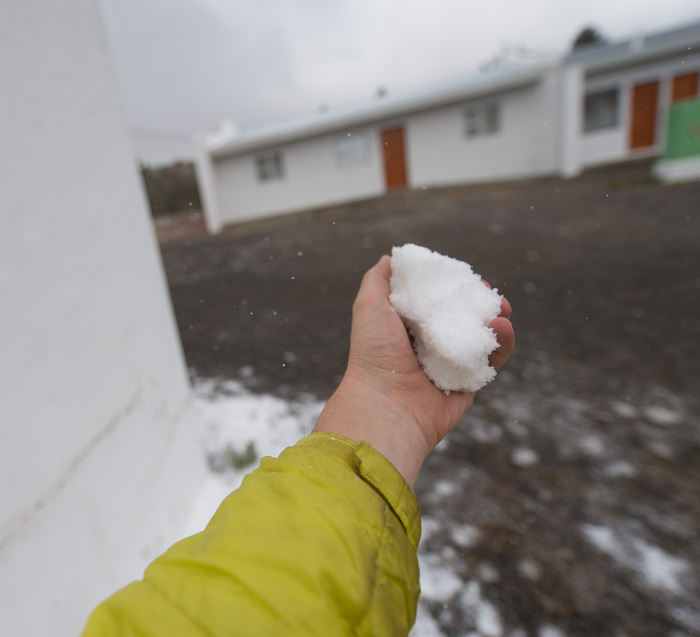 | Still snowing... we spent the evening in town eating lamb shank ("We buy 15 lambs a day from across the street") and talking with Sutherland locals. | |
