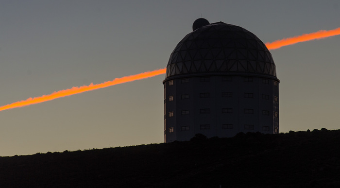 | This is the 1-meter dome that I was observing at... but I was closed down due to winds on my final night. I had to put my tripod on its super-low, super-wide setting so that it wouldn't get blown over in the winds. I illuminated the dome with my iPhone, which you can see a bit of a trail from. This telescope dome is a lot bigger than it looks here. | |