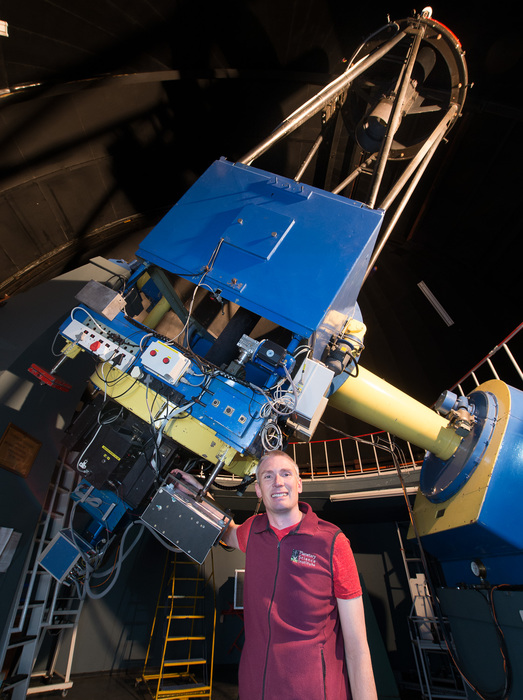 | Selfie at the 1-meter. I had a week of time to monitor comets and asteroids. Note the closed dome slit... prime observing time, but humidity kept the dome closed. | |
