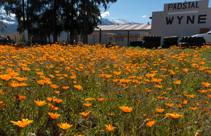 | If you drink South African wine... thank these guys! Just past the padstal where I stopped for lunch, they waved me over from the highway. The two guys work in the vineyards; the one in front built the shed where they live. The local vineyard is De Wet Cellar, which is largely a wholesale supplier. That's snow in the peaks behind... | |
