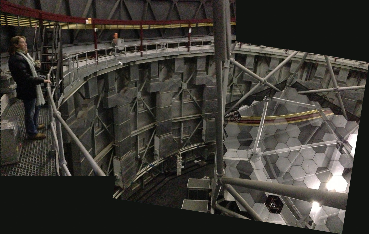 Amanda inside SALT! That's the 11-meter mirror below. It's made of 91 smaller 1-meter hexagonal mirrors. All of them are spherical, rather than parabaloid, which means that they can be taken out and put back in a different position because they're all identical. The mirror segments that look dark really are -- they are the ones that are most in need of re-aluminizing. You can see at least two of the mirrors are missing, due to aluminizing or other maintenance. From an optical standpoint, a missing mirror does not make a big difference.