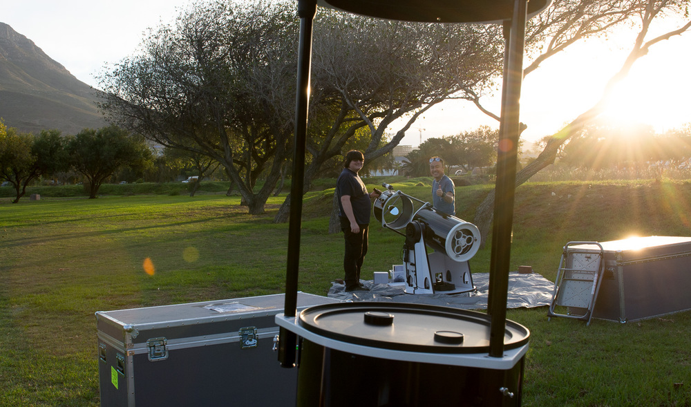 Con Tsang and RJ Smith have unpacked theirs as well. These are brand new 16" dobsonians. Typically Dobsonians are very manual telescopes, but these have drive motors and have most of the capability of much fancier scopes. They're a lot cheaper, too.