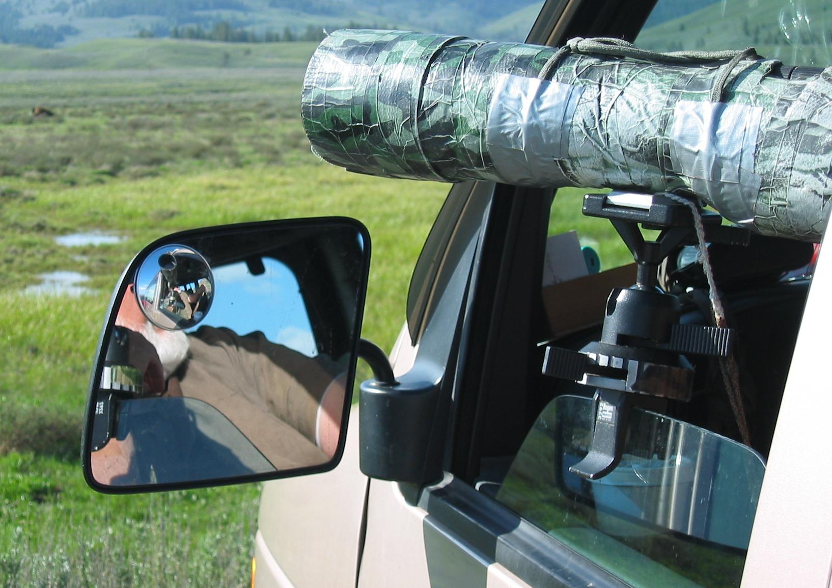 A grizzly bear (not seen) is viewed by a craftily-camouflaged telescope hidden in an SUV.