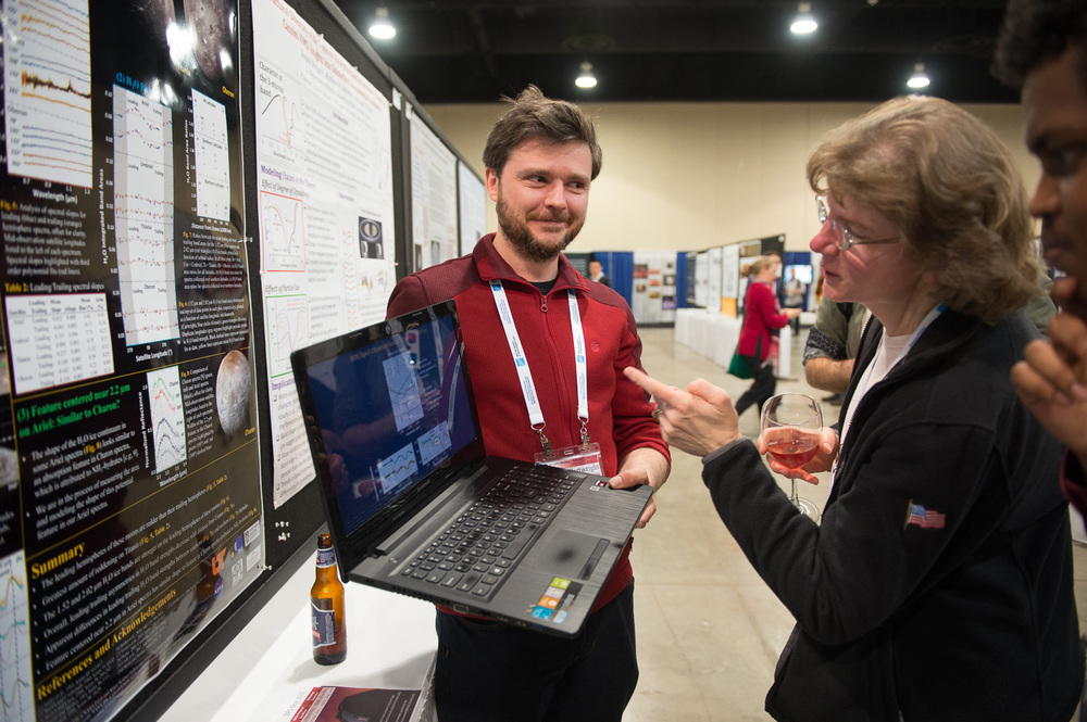 Richard Cartwright (APL) tries to impress Anne Verbiscer with his plots of the 2.2-micron Uranian satellite dark material distribution.