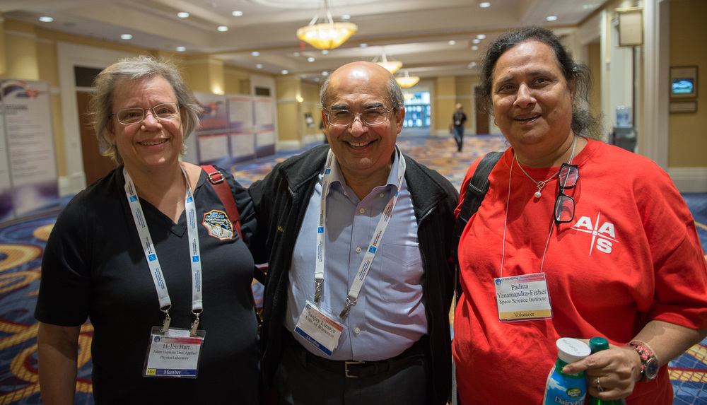 Helen Hart (APL), Sanjay Limaye, and Padma Yanamandra-Fisher (SSI) outside the plenary hall.