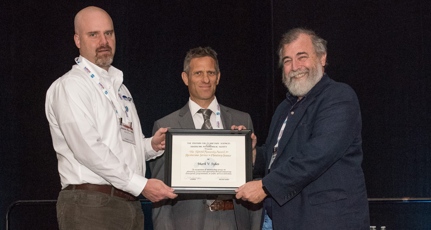 | Mark Sykes (PSI) gets the Masursky award from Jason Barnes. That's Hal Masurky's son Leo on the right, who used to work with Mark in the 1990's. |