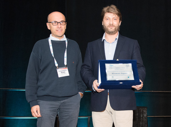 | Alessandro Rossi (IFAC-CNR) presents the Paolo Farinella prize to Kleomenis Tsiganis (Aristotle University of Thessaloniki). |